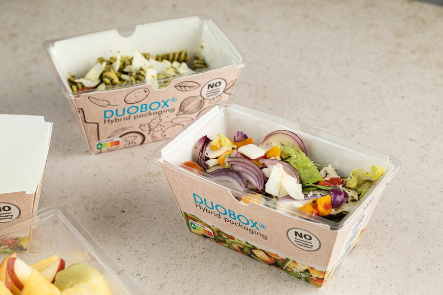 Das Ergebnis ist die Duobox. Diese Duobox eignet sich für Fisch, Fleisch, Geflügel und Fertigmahlzeiten. Bei der Duobox wird eine Einlage aus dünnwandigem Kunststoff von hochwertigem Karton umschlossen.